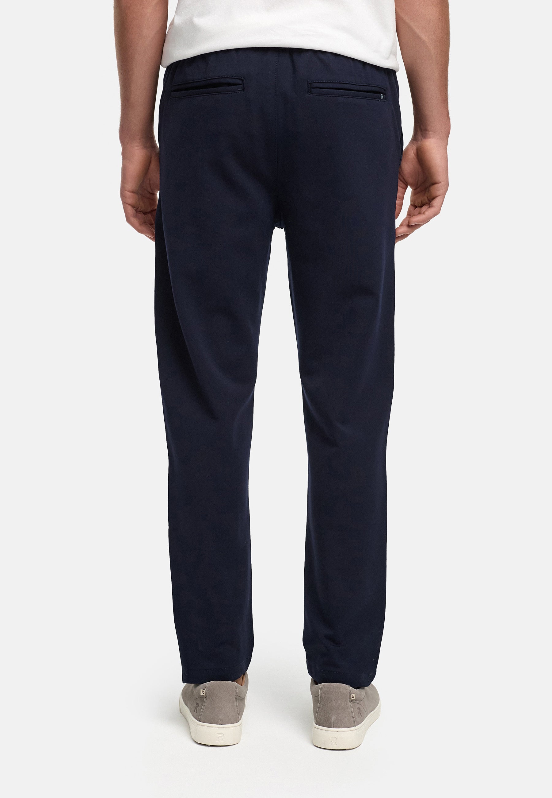 - Seitliche Eingrifftaschen ergänzen das Design, während die Beine locker fallen und bis über die Schuhe reichen. Insgesamt wirkt sie wie eine stilvolle Mischung aus formeller Anzughose und bequemer Alltagshose.